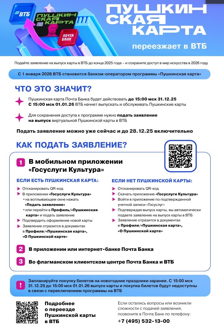 Пользователи «Пушкинских карт» от 14 до 18 лет имеют право на перевыпуск карты в ВТБ, для этого можно воспользоваться инструкцией по подаче заявлений на перевыпуск «Пушкинскойкарты»